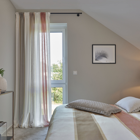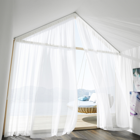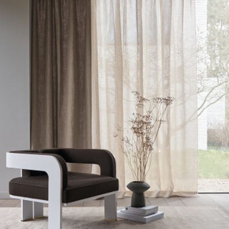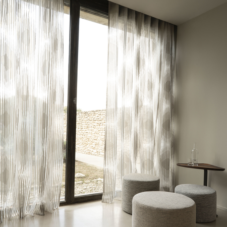 A fényáteresztő függöny nem csak a belátást tudja meggátolni, de öltözteti is a teret, akár önmagában is. Gyárilag alul ólomzsinórral vannak ellátva. 300 cm-nél nagyobb belmagasságoknál a legtöbb ilyen anyagot el lehet forgatni, ebben az esetben az alját leginkább egy nagyobb felhajtással szoktuk levarrni.
